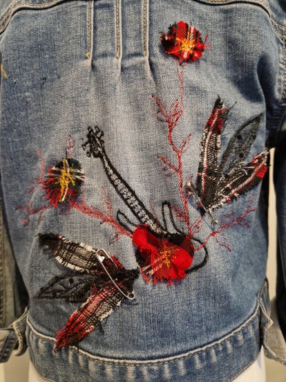 Veste en jean upcycling, brodée avec du plumetis/wax et ses plumes, taille 8/9 ans.