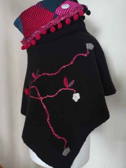 Poncho en laine bouillie, tissu wax, broderie fleur et son galon pompons.